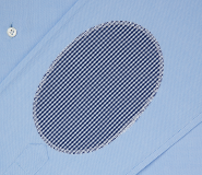 This finishing presents the contrast inside collar band, contrast side buttons placket and contrast patches sewn on the elbows. We recommend choosing a checked contrast fabric for solid shirts and vice versa.