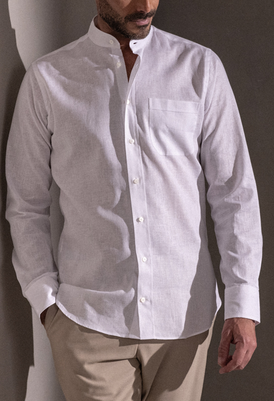 A white shirt is a wardrobe essential, adaptable to any occasion. Our custom Italian men’s white shirts come in a range of fabrics, from crisp poplin for everyday wear to luxurious Sea Island cotton and silk for special events. With options like refined point collars, relaxed band collars, or classic spread collars, you’ll find the perfect style for work, events, or casual elegance.